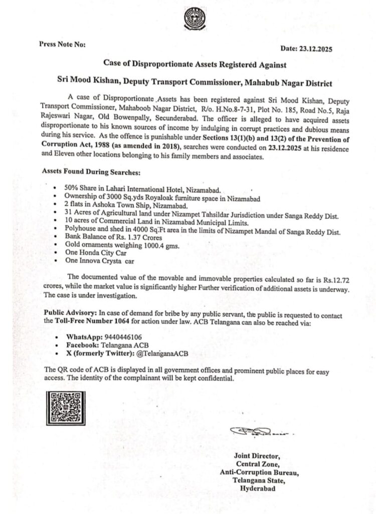 నారాయణఖేడ్ ప్రాంతంలో 31 ఎకరాలు, నిజామాబాద్ ప్రాంతంలో 10 ఎకరాలు, నిజామాబాద్ జిల్లా కేంద్రంలో ఉన్న లహరి ఇంటర్నేషనల్ హోటల్లో 50% వాటా, రాయల్ ఓక్ ఫర్నిచర్ షాపుకు లీజుకు ఇచ్చిన 3000 గజాల వాణిజ్య స్థలం, కిలో బంగారు ఆభరణాలు, బ్యాంకు ఖాతాలో రూ.1.37 కోట్ల నగదు, అశోక్ టౌన్ షిప్లో రెండు ఫ్లాట్లు, 4000 గజాల స్థలంలో పాలి హౌస్ ఉన్నట్లు గుర్తించామని తెలిపిన ఏసీబీ డీజీ చారుసిన్హా