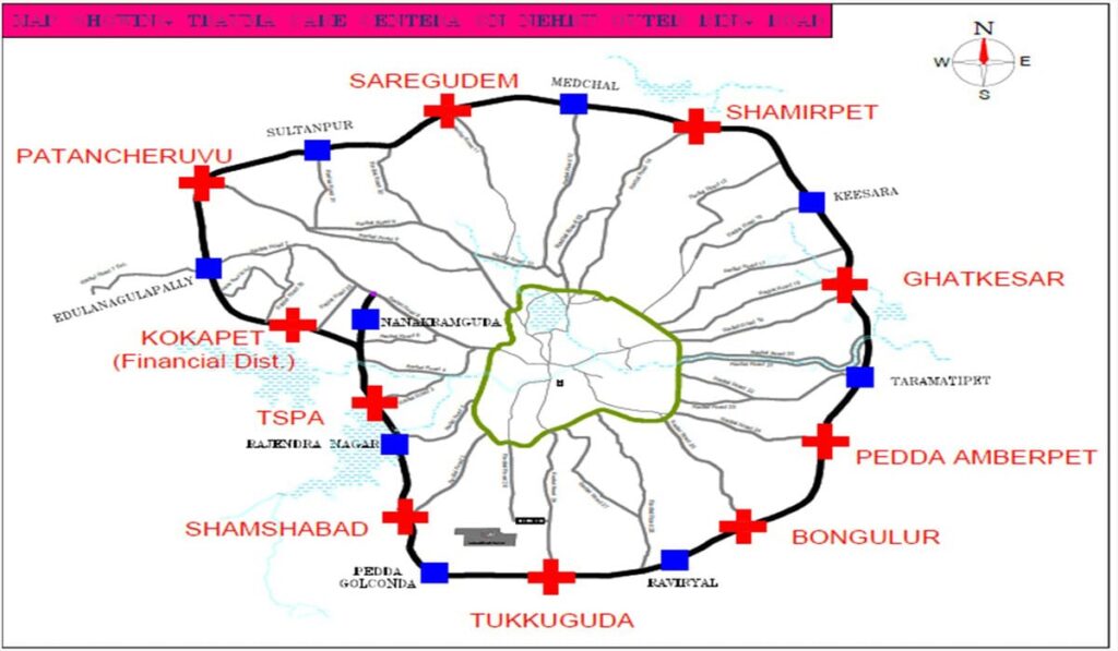 పెద్ద అంబర్పేట్, జల్పల్లి, షంషాబాద్, తుర్కయాంజల్, మణికొండ, నర్సింగి, ఆదిబాట్ల, తుక్కుగూడ, మేడ్చల్, దమ్మాయిగూడ, నాగారం, పొచారం, ఘట్కేసర్, గుండ్లపోచంపల్లి, తూముకుంట, కొంపల్లి, దుండిగల్, బోలారం, తెల్లాపూర్, అమీన్పూర్, బడంగ్పేట్, బండ్లగూడ జగీర్, మీర్పేట్, బోడుప్పల్, పీరజాదిగూడ, జవహర్నగర్, నిజాంపేట్.