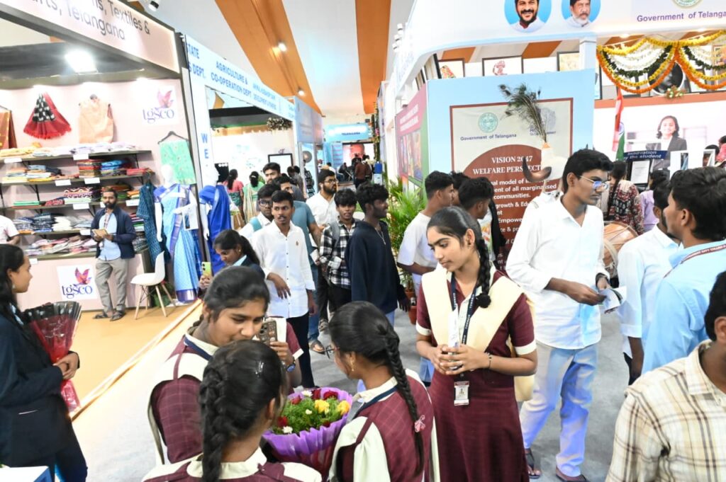 రాష్ట్ర ప్రభుత్వం అత్యంత ప్రతిష్టాత్మకంగా నిర్వహించిన తెలంగాణ రైజింగ్ గ్లోబల్ సమ్మిట్ లో ఏర్పాటు చేసిన వివిధ ప్రభుత్వ స్టాళ్లు, కార్పొరేట్ కంపెనీల స్టాళ్లను బుధవారం పెద్ద ఎత్తున విద్యార్థినీ, విద్యార్థులు సందర్శించారు. ఈనెల 8 ,9 తేదీలలో నిర్వహించిన గ్లోబల్ సమ్మిట్ లో ఏర్పాటు చేసిన స్టాళ్లలో తమ ప్రోడక్టులను ప్రయివేటు సంస్థలు ప్రదర్శించాయి. నేడు ప్రధానంగా నగరంతోపాటు వివిధ జిల్లాల నుండి ప్రత్యేకంగా వచ్చిన ప్రభుత్వ సంక్షేమ గురుకుల పాఠశాలలు, డిగ్రీ కళాశాలలు, ఎన్.ఎస్.ఎస్ విద్యార్థులను ఎంతగానో ఆకట్టు కున్నాయి. ప్రధానంగా ఏరోస్పెస్, మూసీ రివర్ డెవలప్మెంట్, హ్యాండీ క్రాఫ్ట్స్, టూరిజం, ఎడ్యుకేషన్, కరీంనగర్ ఇక్కత్, ఫిలిగ్రి, చేర్యాల పెయింటింగ్స్, సైబర్ క్రైమ్ చెదనలో ఉపయోగించే పలు ఆధునాతన పరికరాలు,డ్రోన్స్ , రోబో తదితర 27 కు పైగా స్టాళ్లు ఏర్పాటు చేశారు. అన్ని స్టాళ్లను విద్యార్థులు అత్యంత ఆసక్తిగా తిలకించారు.