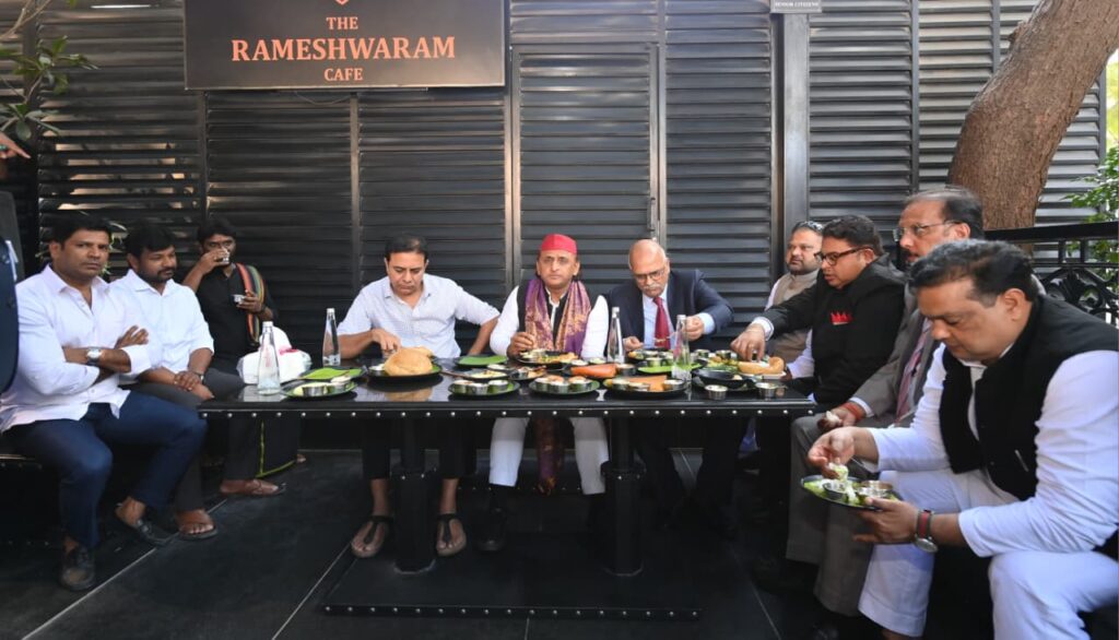 సమాజ్వాదీ పార్టీ అధినేత అఖిలేష్ యాదవ్, భారత రాష్ట్ర సమితి వర్కింగ్ ప్రెసిడెంట్ కేటీఆర్ హైదరాబాద్లోని ప్రముఖ ‘రామేశ్వరం కేఫ్’లో మధ్యాహ్న భోజనం చేశారు. నగరంలో ఎంతో ఆదరణ పొందిన రామేశ్వరం కేఫ్ రుచుల గురించి, అక్కడ లభించే ప్రత్యేకమైన టిఫిన్స్ గురించి తెలుసుకున్న అఖిలేష్ యాదవ్ ఆసక్తి కనబరచడంతో, కేటీఆర్ అక్కడే మధ్యాహ్న భోజన ఏర్పాట్లు చేశారు. సరదాగా సాగిన ఈ విందులో ఇరువురు నేతలు దక్షిణాది రుచులను ఆస్వాదిస్తూనే.. పలు రాజకీయ అంశాలపై కాసేపు ముచ్చటించారు.