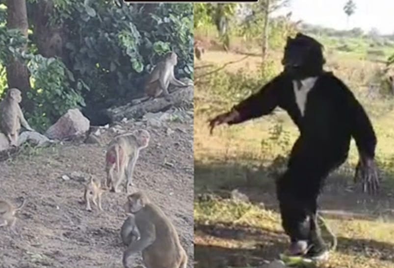 కోతులను త‌ర‌మేస్తాన‌న్న‌ హామీ…చింపాజీ వేషం