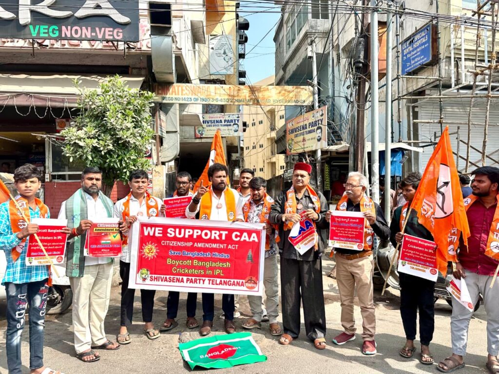 బంగ్లాదేశ్ లో హిందువుల‌పై జ‌రుగుతున్న దాడుల‌కు నిర‌స‌గా తెలంగాణా శివ‌సేన ఆధ్వ‌ర్యంలో హైద‌రాబాద్ లో నిర‌స‌న ప్ర‌ద‌ర్శ‌న చేశారు. పార్టీ రా|ష్ట అధ్య‌క్షులు శివాజీ ఆధ్వ‌ర్యంలో నిర‌స‌న తెలిపారు. బంగ్లాదేశ్ జాతీయ జెండాను ద‌గ్దం చేశారు. ఈ సంద‌ర్భంగా శివ‌సేన నేత కీల‌క వ్యాఖ్య‌లు చేశారు. IPL లో పాకిస్థాన్ దేశం పైన విధించిన ఆంక్షలు బాంగ్లాదేశ్ పైనా విధించాల‌ని డిఆమ‌డ్ చేశారు. IPL లో బాంగ్లాదేశ్ ఆటగాళ్లు ఉంటే అడ్డుకుంటామ‌ని, అవ‌స‌ర‌మైతే దాడులు చేసేందుకు కూడా వెనుక‌డుగు వేయ‌మ‌ని ప్ర‌క‌టించారు.